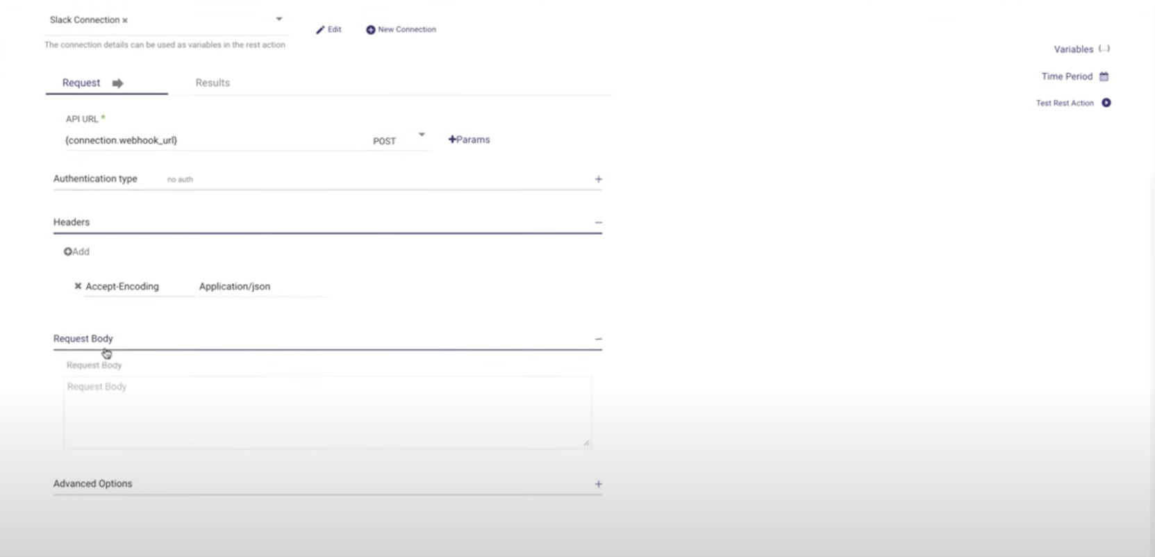 Setting up a Slack Alert: Select “REST Action” to create a Slack alert and define the connection. You can configure the request body with variables to customize the Slack message with relevant data from Snowflake.