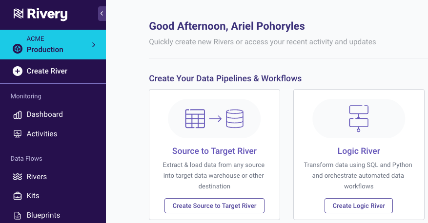 Step 2: In Rivery, click on the Create Source to Target River button (River is the Rivery term for data pipeline).