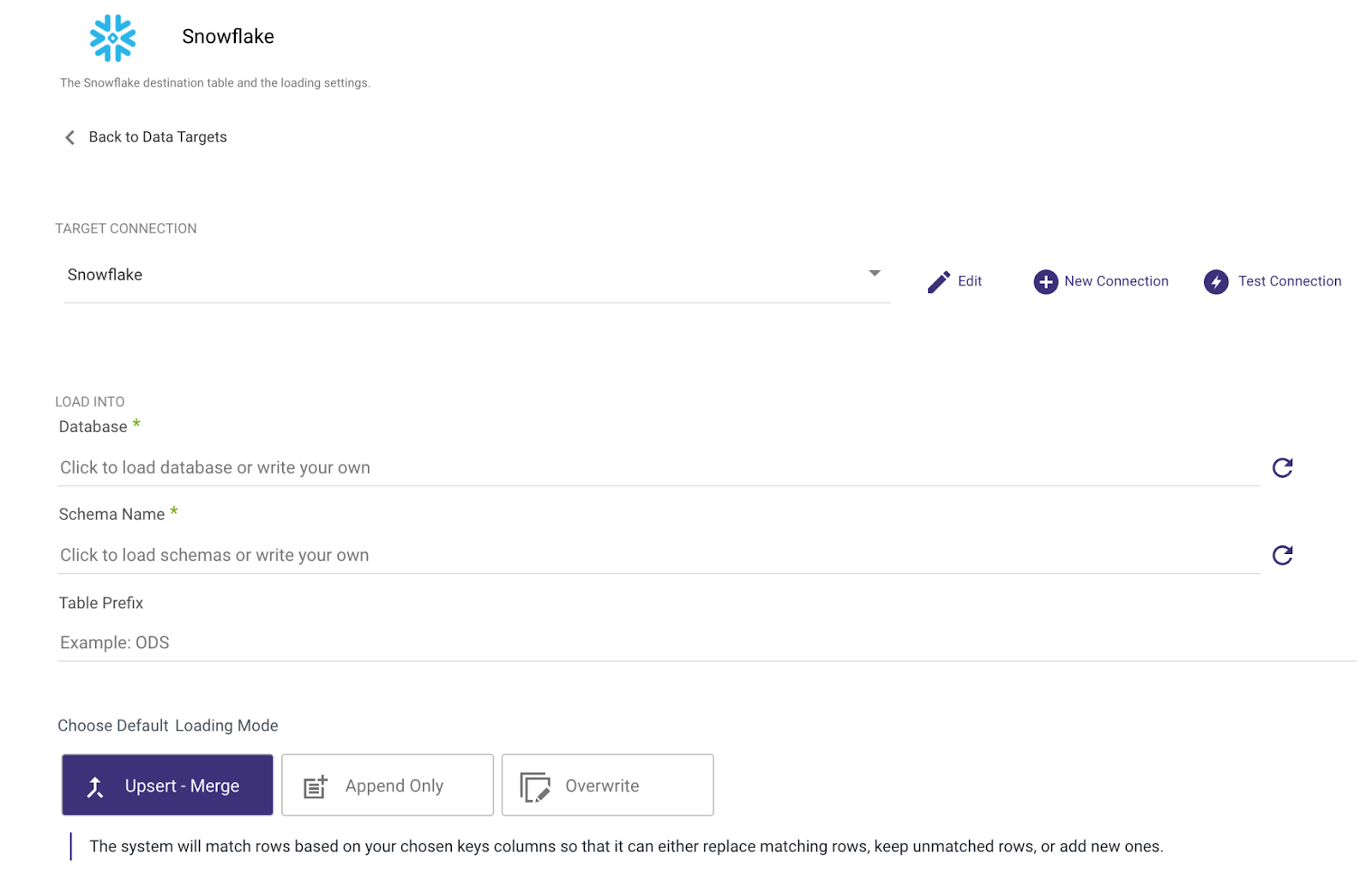 Step 8: Define your data loading mode. Choose between Upsert-Merge for incremental loads that will update and insert new records, Append to only insert new records, and Overwrite to replace the entire dataset within your Snowflake target tables. For more details on the different loading mode options, please refer to Rivery’s Snowflake documentation.